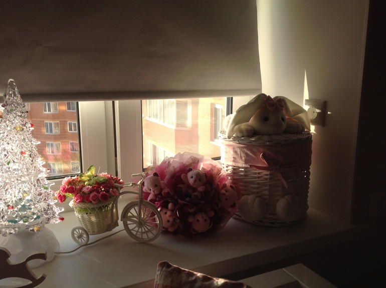 Штор пока нет, а сторона солнечная, поэтому временно повесили " рулонку "