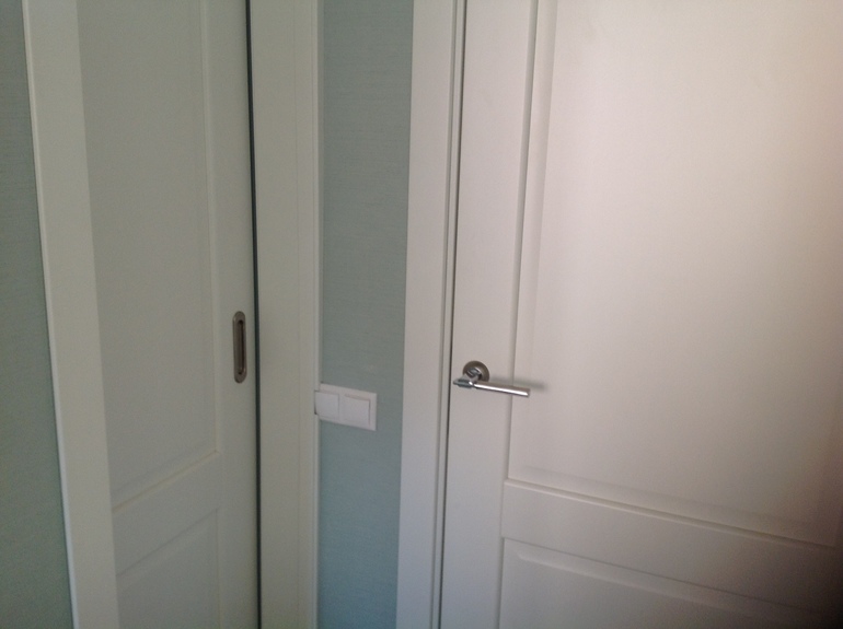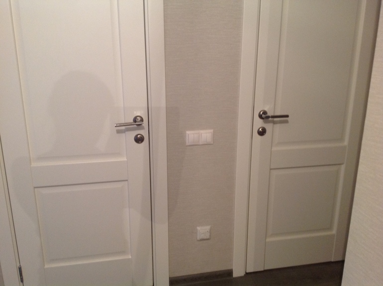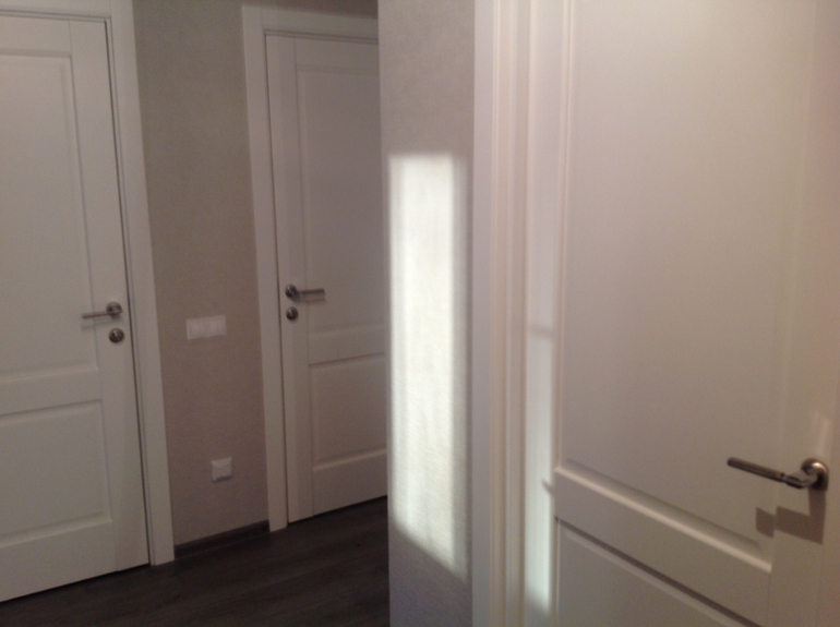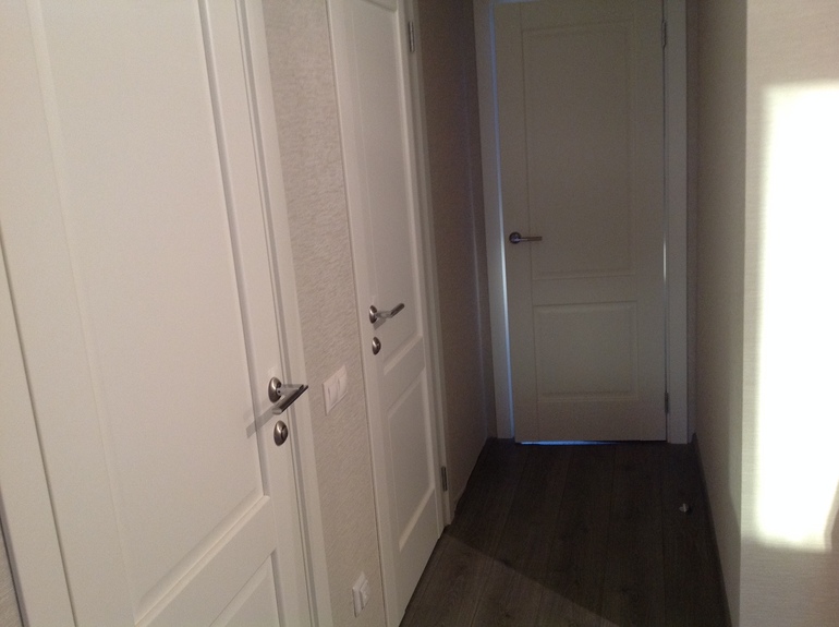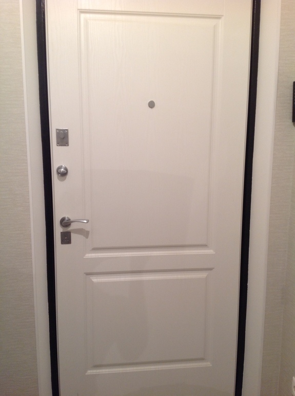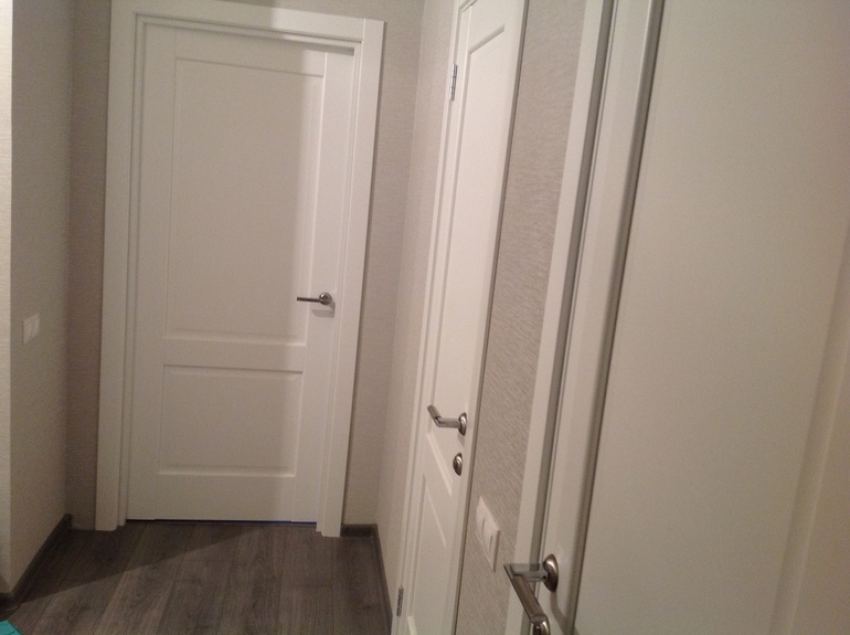 Вид на входную дверь. Входная дверь ДВЗ, очень ей довольна. Межкомнатные Волховец Галант, тоже довольна, если опустить эпопею с доставкой.Именно из-за них мы не смогли переехать раньше. Но не будем о грустном.