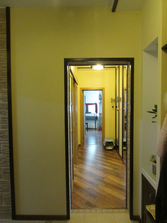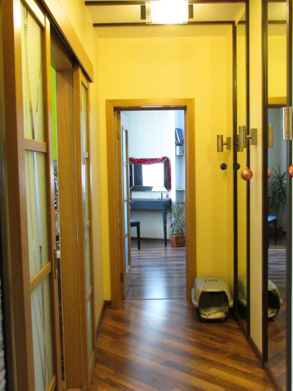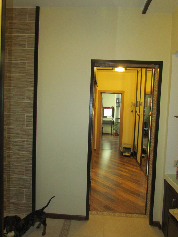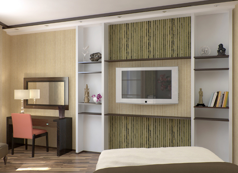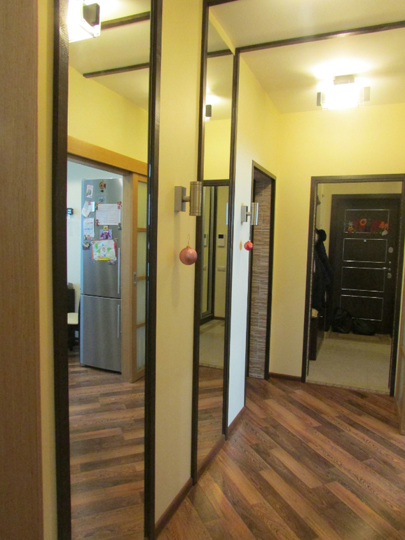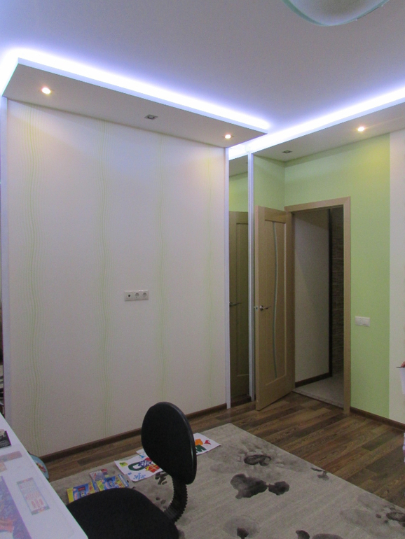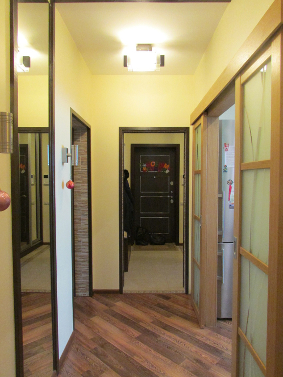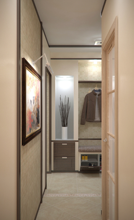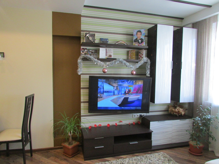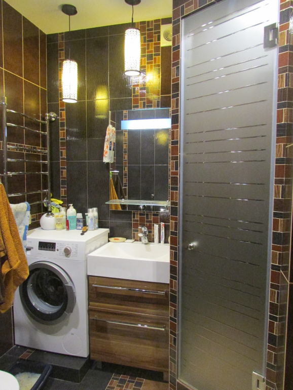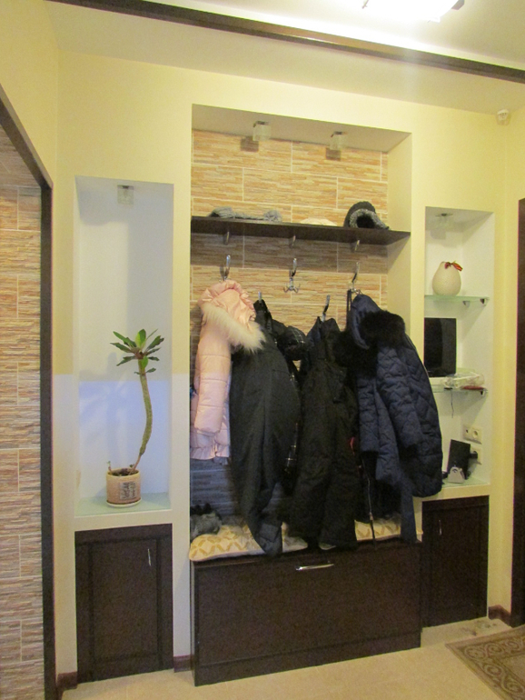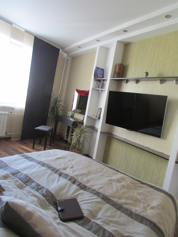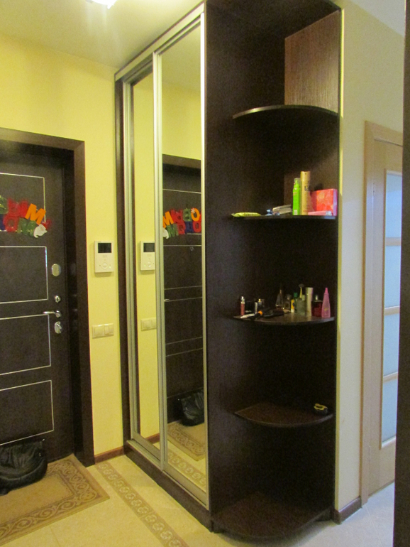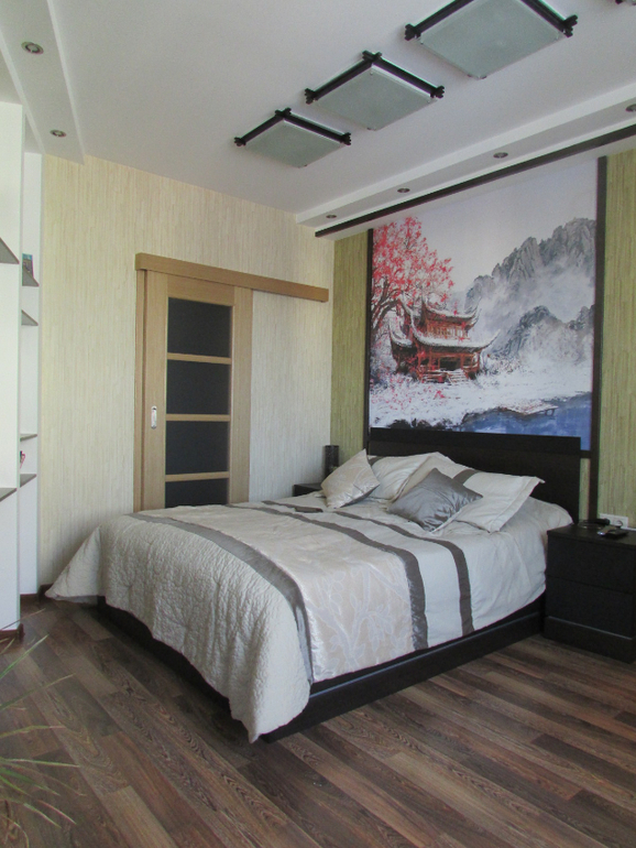 Не впечатлилась. Ни визуализацией с кучей скучных клише (радиусные шкафы и полки, двери с фигурными стеклами, "японские" мотивы в спальне, фотопечать...), ни исполнением — так можно отремонтировать помещение и не прибегая к помощи дизайнеров вообще. Милая квартирка, уютная. Но никакой задумки интересной не вижу.