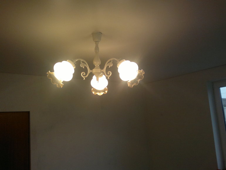 Электрика, освещение.Я никак не могла найти люстру под стиль будущей спальни. То цвет не тот, то плафоны не подходят, то с подвесками перебор. Мама предложила взять и временно повесить очень старую люстру, пока не найду свою. Она подходит по стилю, но учитывая, что мебель белая мне хотелось и люстру белую. Решили красить, выкинуть то не жалко.