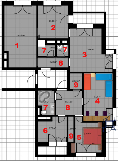 Не через всю. Там пройти один раз нужно. Дверной проем не помешал бы, но опять же, по-моему там несущая стена.Зато квартира делится на тихую и шумную половину. Игры детей не будут мешать в спальне и кабинете. Шумы из кухни и гостиной не будут мешать детям.Там между кабинетом и спальней разницы-то будет метр.Санузел нормальный-необходимое и достаточное. Зачем больше? Что там делать? А вот в холле нужно иметь возможность спокойно разойтись, когда столько человек живет в одном пространстве, и желательно дверями при этом не стучаться.