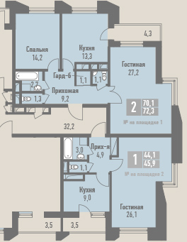 Если оставить вариант 1, то лучше поменять местами спальню и кабинет, тк сейчас получается, что Ваша спальня пол кухней соседей. Может быть шумно