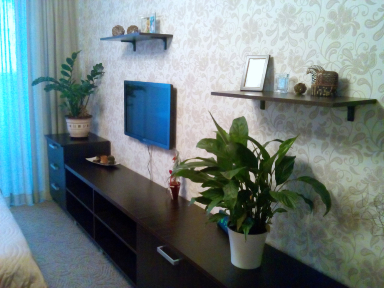 согласна про картину над кроватью. Даже триптих можно. Горшки у цветов сделать одинаковые, и, может быть, в тон будущим декоративным подушкам, цветы поставить рядом у окна. На место спатифиллюма какую нибудь фигурку основательных размеров. На полочки фоток побольше. В открытие полки под телевизором можно яркие пледы положить, журналы всякие. На прикроватных тумбочках торшеры заменить или плафоны как-то задекорировать, сделать яркими. Шторы не меняйте, они классные))))