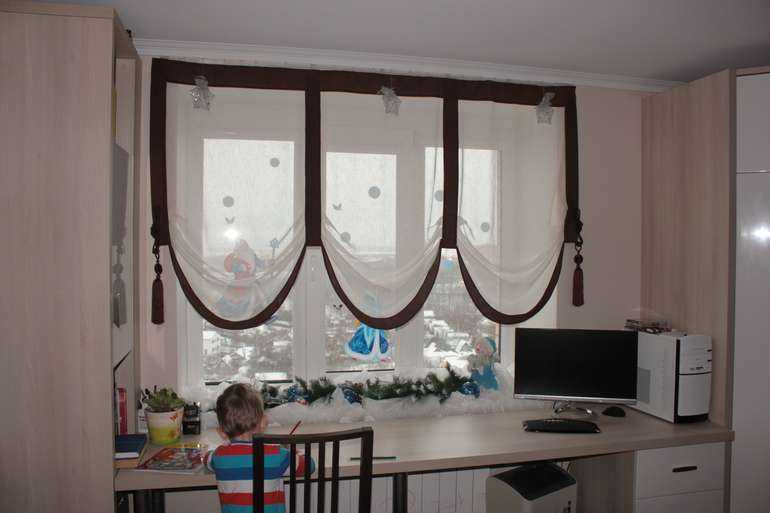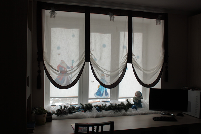 Очень понравилось) идея штор- потрясная,-я бы тоже сперла) но не увидела раньше. уже заказала вчера другие_ год не могла придумать...но на смену обязательно сошью- у нас точно такое окно и стол со шкафчтками