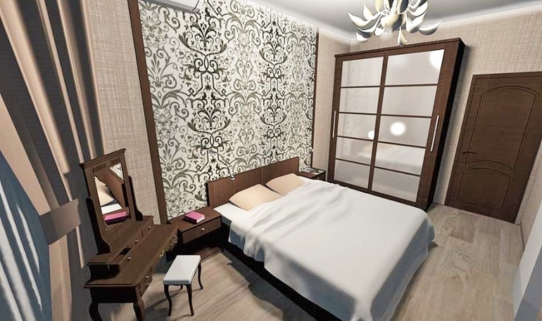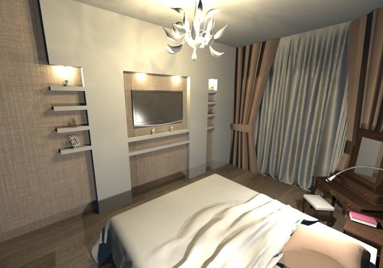 Интерьерное решение спальниПожелания Заказчиков были простыми и ясными: спокойная спальня, темная мебель, очень хотим ниши с подсветкой и на потолке led-панели без люстры. Единственное, что в итоге пришлось поменять так это как раз led-панели, с люстрой все-таки оказалось уютнее, теплее и нежнее.