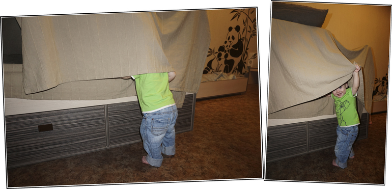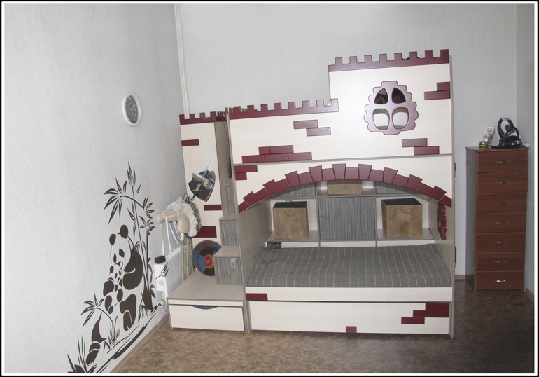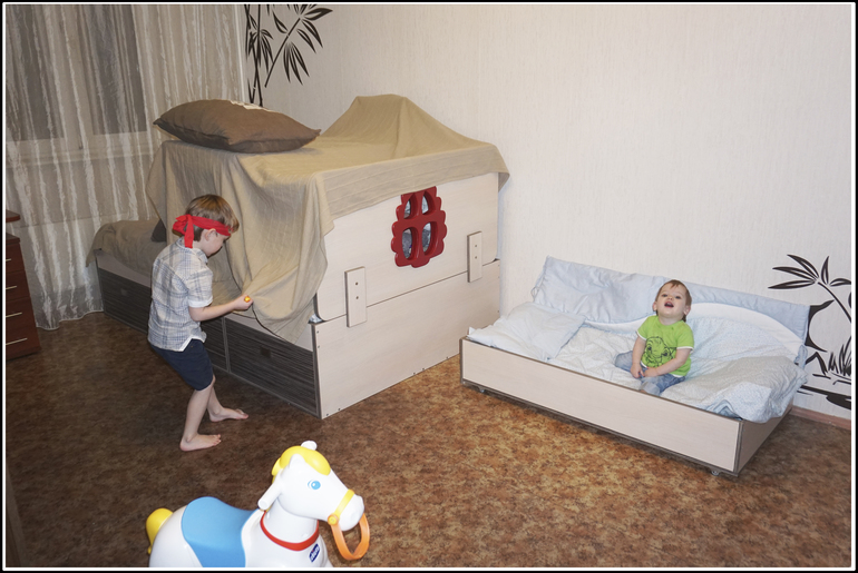 Одновременно с этим в арсенал моих бытовых развлечений добавилась одна проблема. Андрей очень полюбил заползать под нашу с мужем кровать и там застревать, громко и отчаянно. Кровать меня и так уже давно подбешивала тем, что во время уборки приходилось вставать на колени и, пригибаясь к самому полу, шваброй выгребать игрушки, свалившиеся в зазор между стеной и ложем. А также игрушки, случайно закатившиеся под кровать, и игрушки, которые намеренно туда закатились посредством детских ног, произрастающих из давно не знавших ремня жоп. А уж когда прибавилась необходимость в день по нескольку раз вести спасательные работы, вызволяя не умеющего давать задний ход человека, я решила, что кровать надобно менять, и как можно скорее. Глупо, конечно, говорить о гармонии и стилистически цельном ансамбле в контексте двух кроватей в то время как вся остальная мебель даже вне контекста стен и пола у тебя наборная, разных цветов, разных текстур и разных, блин, эпох. Однако, мы решили повторить выстраданное и полюбившееся нам сочетание в детской кроватке в виде зАмка - «дуб кремона», «зебрано» и «бургундский».