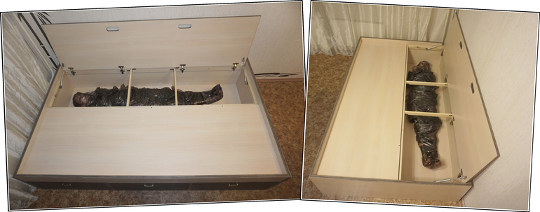 Для облегчения процесса мы использовали подъемный механизм с газлифтом, очень рекомендую - ощущение, что крышка невесомая, он как будто сам её поднимает, а ты лишь на начальном этапе задаешь направление. Удобно - не то слово, кровать-то в длину 2 метра, крышка немаленькая такая вышла, в том числе и по весу сама по себе. В эту нишу можно убрать, в-первых, тело.