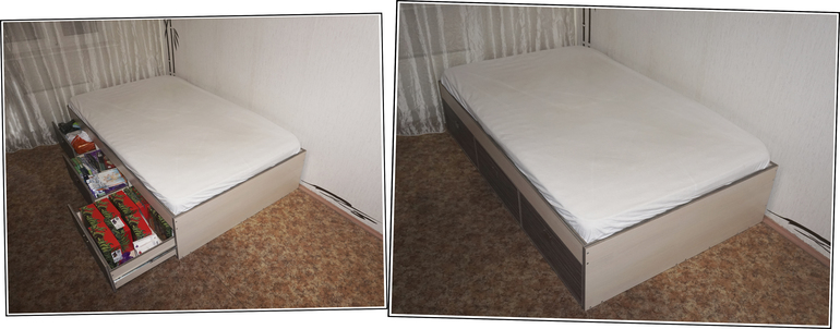 Матрас менять мы не планировали, он хороший, ортопедический, и относительно недавно был обновлен, так что габариты кровати остались неизменными за тем лишь исключением, что всё абсолютно пространство под кроватью мы заполнили нишами для хранения. Вообще, конечно, хотелось сделать ящики по обеим сторонам кровати: подумалось, что при переезде в новую квартиру было бы здорово поставить кровать таким образом, чтобы никто ни через кого не перелезал и подойти можно было и справа, и слева, ну и, соответственно, ящики бы имелись и под моим, и под папиным местом. Но до переезда ещё хрен знает сколько, а сейчас кровать стоит в углу, и если делать ящики с обеих сторон, то половина их окажется заблокированными. А это меня ну никак не устраивало. И решили: будет квартира - будет новая кровать, а сейчас делаем так, как удобно в данный момент. То есть делаем ящики только по одной стороне.