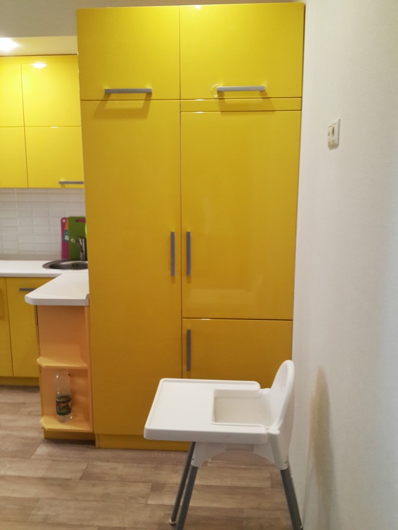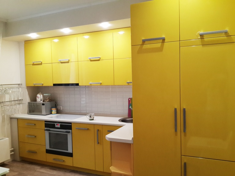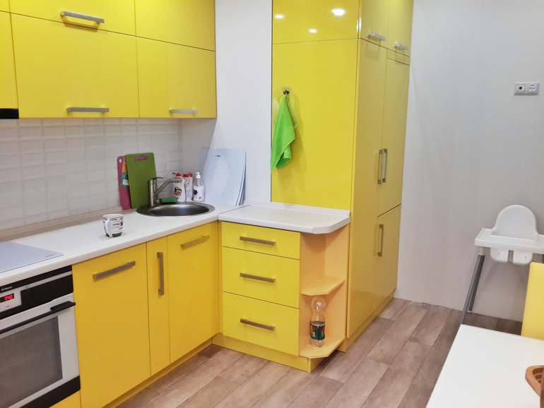 его и закрыли шкафом. слева дверца-шкаф с полками и отверстием для счетчиков. там же будет розетка и надеюсь когда-нибудь кофемашина. уж очень мне хотелось желтую кухню! ее мы и сделали. о чем ни разу не пожалели. очень поднимает настроение и не раздражает. тепло и солнечно. чуть приглушили яркость кухни сделав однотонные обои по бокам и добавили изюминку обоями на противоположной стене