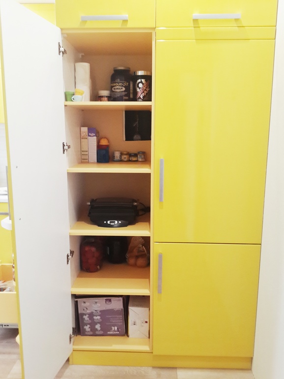 все ящики с доводчиками. кстати, заметили , у меня нет полок с дверцами. все в ящиках. они достаточно глубокие.кастрюли мне удобнее хранить так. как и все остальное.