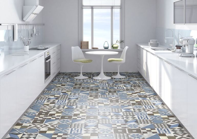 Плитка в технике пейчворк. Очень модно, но сложно выдержать такую монохромность в остальном, чтоб акцент был на пол. Если посмотреть на фото — оно эталонное. Белая мебель, белые шторы. Но если даже сюда добавить хотя цветную штору, уже эффект не тот.