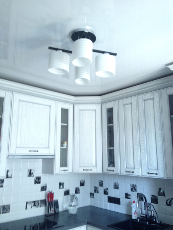 На потолок решено глянцевый натяжной потолок, люстру выбрали, ждем окончания ремонта, надо установить до сбора кухни.