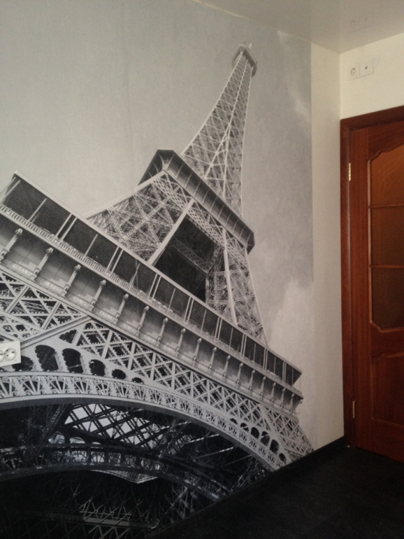 На стены обои, какие? Конечно же, Эйфелева башня!!!! Ищем фотообои, ищем нужный вид, выбрали, опять ждем изготовления. Это на одну стену, на другие просто белые, но структуру выберем, как получим фотообои. Не представляете, мы с этим 2-хметровым тубусом ездили в магазин обои подбирали.