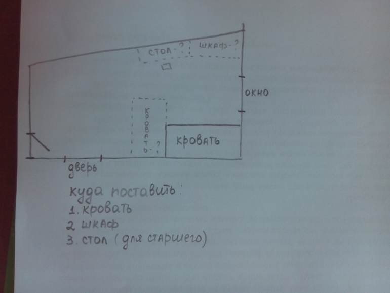 Как смогла нарисовала нашу кривую комнату. Видимо, нам придется на заказ делать мебель, но подскажите как? в углу вот мне кажется можно шкаф купе поставить, потом стол (я пунктиром нарисовала). еще одна дверь на картинке это в кладовку, вот слева от кладовки сейчас стоит комод, может так его и оставить? плюс хочу всякие шкафчики для игрушек. Придумала такие типа пуфики, на них и сидеть можно, а внутри игрушки, книжки и т.п.
