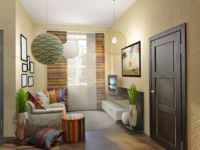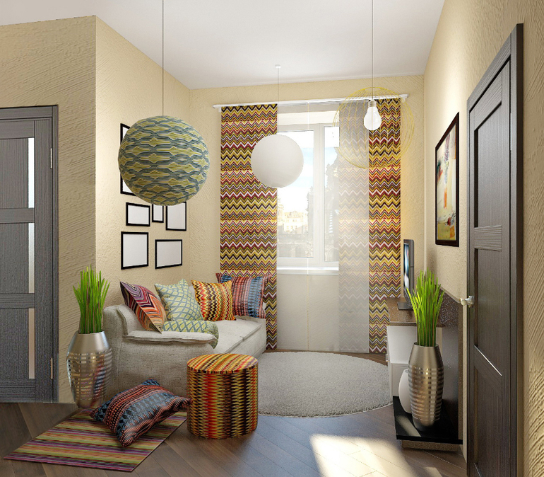 Все здорово, только чисто на мой вкус, я бы взяла однотонный акцент, бирюза, например (я о шторах, подушках и пуфе). Или же радужное, но без острых углов на рисунке. А так очень уютно.