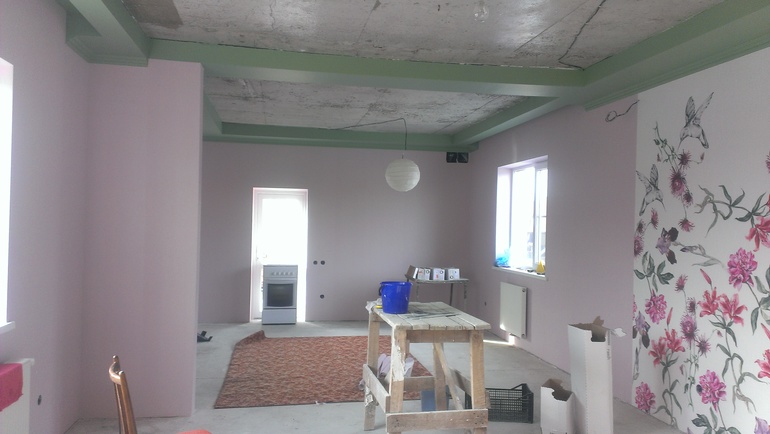 Ой, как мне нравятся такие балки на потолке!))) многообещающие заготовки) И цвет розовый и зеленый это прям мое)) буду ждать, что у вас получится)) это что за комната будет? Гостиная?