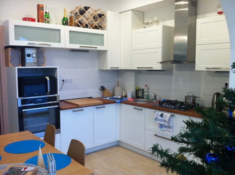 Изначально кухня была с балконом, но мы решили его застеклить и совместить с кухней, что оказалось очень верным решением, в смысле площади это очень спасло, в левую "нишу" балкона встал,как родной,холодильник.