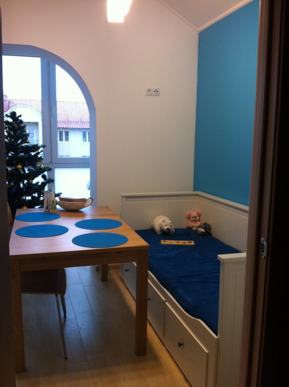 Мы очень хотели,чтобы на кухне было "мягкое место", но не на советский манер, а как-то стильно. Искали варианты, в интернете было много классных идей, но вот такое "разовое" исполнение вставало в приличную копейку...И тут икая,храни тебя Бог,преподнесла свой подарок-в виде диванчика,который просто идеально вписался по размерам и по цвету