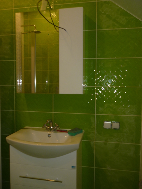 Это фото ещё вовремя ремонта, плитка ещё не отмыта. Углы мастер закрыл пластиковым уголком, я читала, что это не правильно, но меня результат удовлетворил. Мне нравиться наш зелёный санузел.