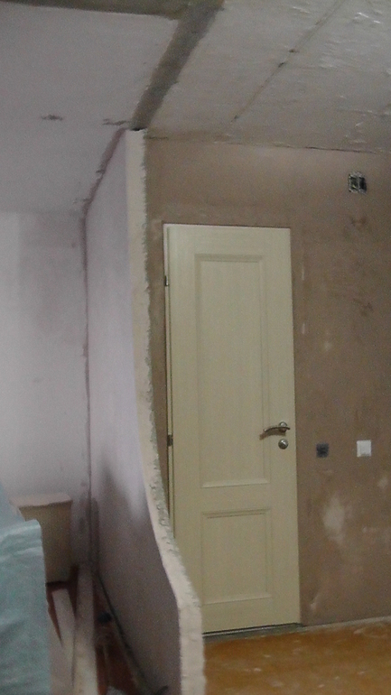 Решили объединить гостиную с прихожей. Сломали стену, убрали дверь. От стены оставили небольшую часть. Обои будут очень светлые. А может как то выделить наш обрубочек??? Всю голову сломала, может вы чего-нибудь подскажете. Девочки не проходите мимо!