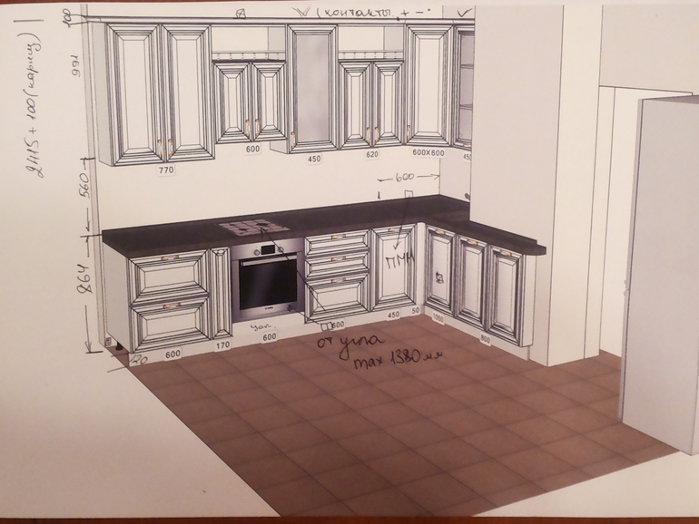 сушка угловая обычная, кухню летом поставили, на компьютере нет фото кухни, позже или завтра сфотографирую и пришлю. ПММ есть 45 см, слева от духового шкафа. по размерам получается следующее (от короба к окну): 1. низ: узкий шкаф 80 ( две двери по 40 см), потом мойка — дверь 45 см, затем поворот и фальшпанель 7 см, затем ящики 40, ПММ 45, духовка 60, шкаф 45, ящики 55.2 верх: шкаф 45, угловая сушка, шкаф 45, шкаф со стеклянным фасадом 45, шкаф под вытяжку 60,шкаф со стеклянным фасадом 45, шкаф с полочкой 55 см. Надеюсь понятно написала))))