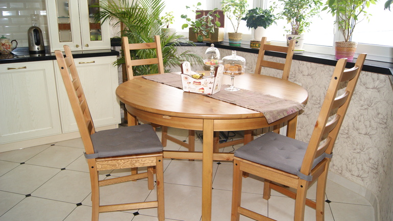 вдохновилась я подобными сочетаниями, видела в квартирном вопросе массу кухонь, со столами не в тон и не в масть, нравилось очень. Почему бы не попробовать?