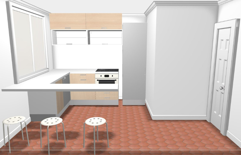 Интерьерное решение кухниДевочки, помогите, а то я уже не могу. Устала страшно. Переезжаем с мужем на квартиру, решили все ломать,и делать для себя. Начали с самого затратного (по нашему мнению) - кухни. Кухонька не большая, по-этому стол категорически отбрасываем. Только барная стойка. Так как в программе барной стойки я не нашла, я обозначила её свободной столешницой. Мебель еще не подбирали, "начинка" просто набросана. Мне важно само расположение мебели. Пол - темно-фиолетовый (чуть ли не черный), стены неееееежно-нежно фиолетовые, близко к белому. Фартук выкладывать будем так: