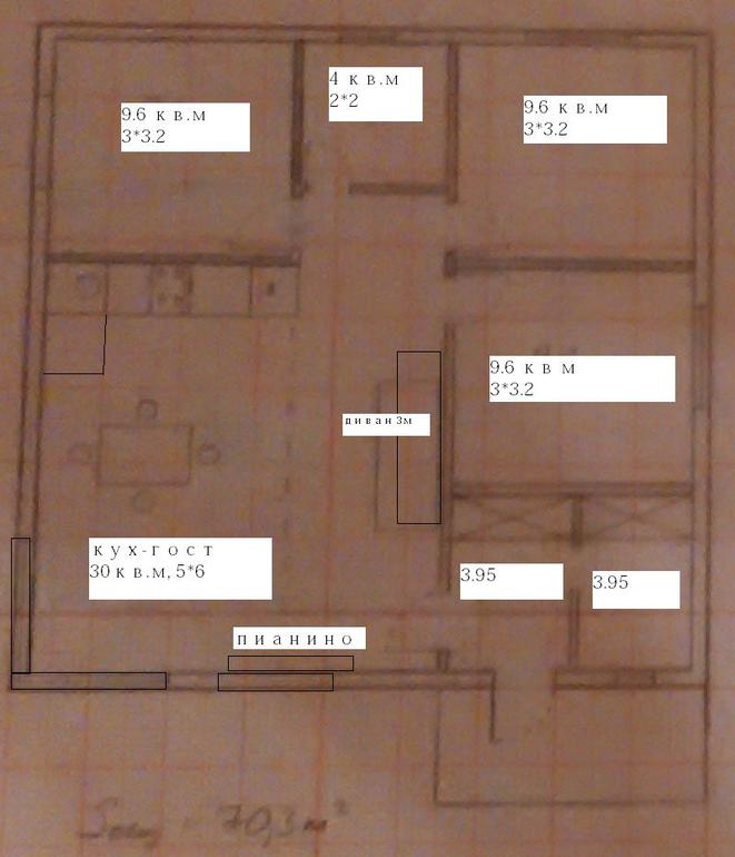 2. Вдоль окна большой угловой, но тогда он частично закроет окно(большое угловое 2*2 до пола), а пианино уже вернуть на место, где диван в первом случае стоял.