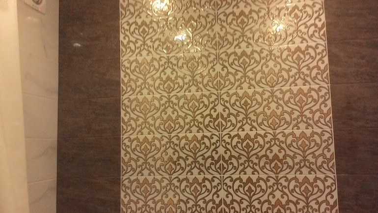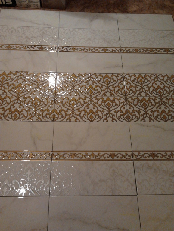 Второй вариант: после золотых пропустить один ряд основной плитки, бордюрчик, а потом белый декор: