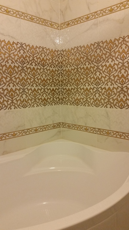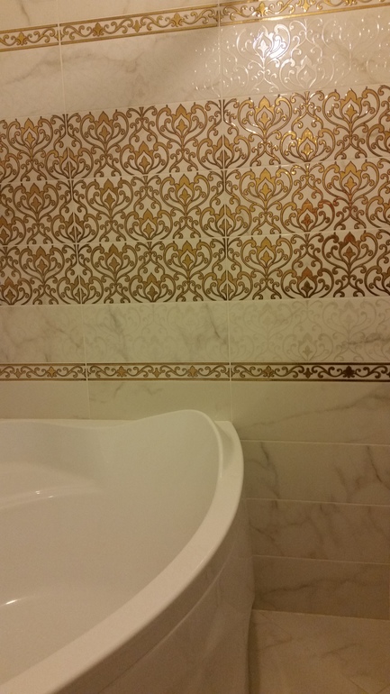 В итоге получился третий вариант))) Вокруг ванны - в середине 3 ряда золотых, по краям по одному ряду белых декоров, дальше бордюрчик. А там где будет раковина - решили повесить зеркало в золотом багете, и плитка с золотым декором там будет лишней.