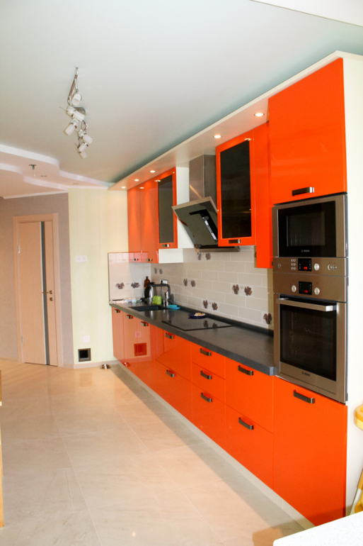 Кухня совмещена с лоджией. (В лоджии белые тканевые жалюзи). Цвет гарнитура более оранжевый, в красный, как на фото, не уходит. Обои светло-зеленые с вертикальными полосами. Часть потолка тоже светло-зеленая.