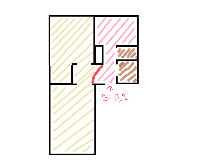 Имеется вот такая квартира. В ванной и туалете уже лежит темно-коричневого цвета плитка. Красная полоса показывает стык ламината и плитки. Теперь собственно вопросы:
