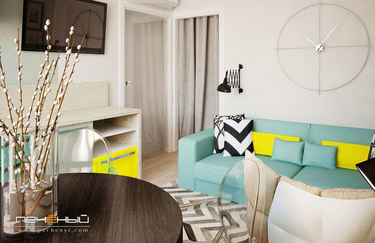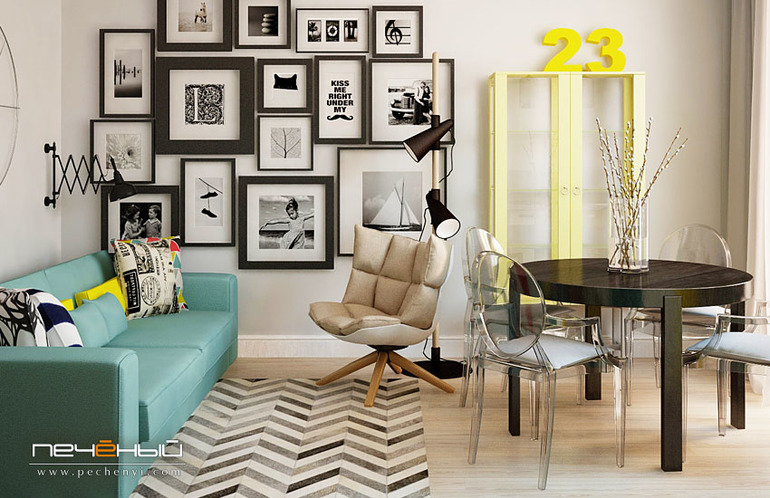 Заказчицей этого проекта выступала женщина, купившая квартиру для сына-студента, поэтому корректно рассматривать интерьер как квартирку для холостяка (если таковым можно назвать молодого парня). Первым делом в глаза бросается композиция из картин на полстены, которую, кстати, можно легко воплотить в своём интерьере. Хитрость в том, чтобы любые понравившиеся изображения вставить в паспарту и обрамить багетом одного цвета, но разной толщины. Вторая хитрость - в расстоянии между рамами картин (оно должно быть маленьким, примерно 3см). И, кстати, да: рамы должны быть большими. Для сравнения, самая «маленькая» картинка в центре - 50х50 см.