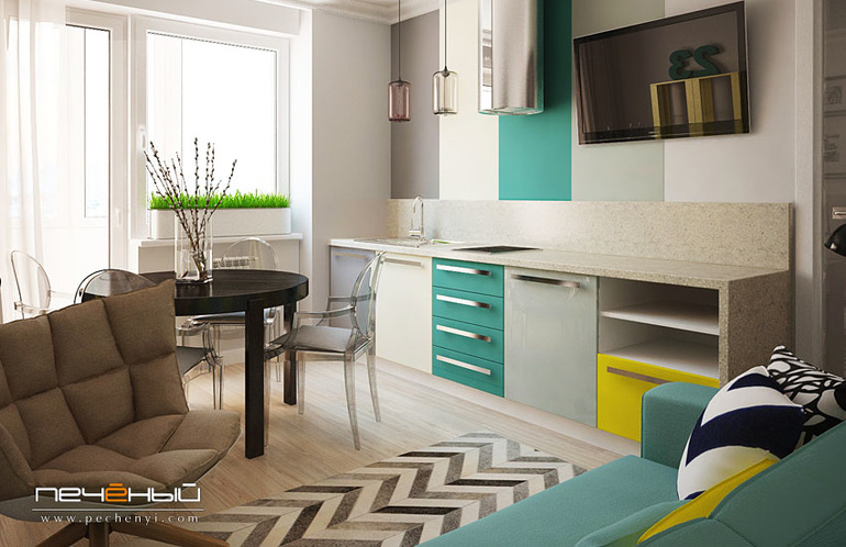 Главная интрига заключается в том, что кухня была перенесена в комнату. Предвижу вопросы и потому отвечаю сразу: да, это незаконно. Кухня, как было оговорено, минималистична до предела, причём заказчица даже отказалась от верхних шкафчиков. Холодильник и духовой шкаф с функцией СВЧ стоят в коридоре, а здесь осталась варочная поверхность да мойка. Кстати, один из вариантов оформления фартука - угловая столешница (скорее, подойдёт тем, кто не слишком активно готовит).