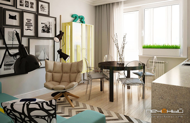 Прозрачные стулья выручают в маленьких пространствах: визуально кажется, будто в столовой зоне только один стол. Кресло становится удобной точкой для просмотра ТВ, ну и для чтения, как водится. Заказчица не хотела штор, однако мы убедили её в том, что с ними комната значительно уютнее.