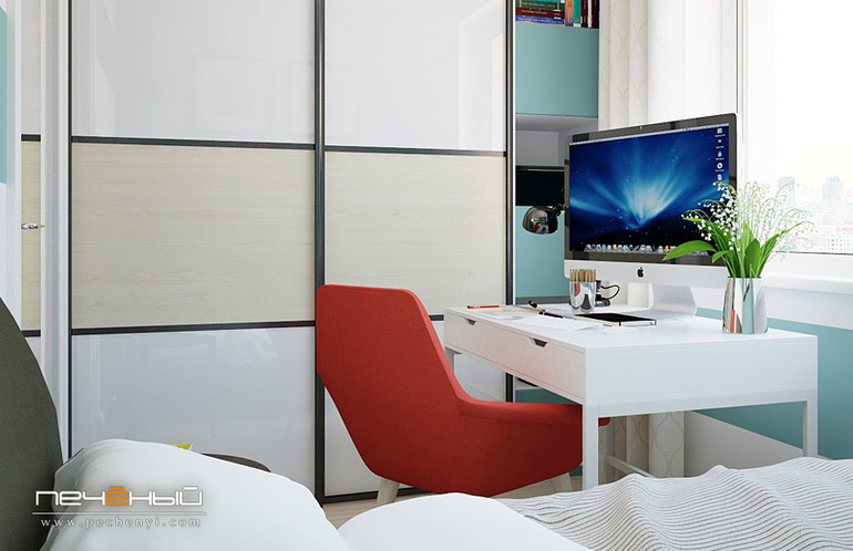 Здесь (ну надо же!) тоже есть шкаф, однако его не обязательно использовать для одежды. В шкафу вполне можно хранить какие-то коробки с вещами, книги, конспекты - мало ли что нужно спрятать от глаз. Как известно, чем меньше вещей лежит на горизонтальных поверхностях, тем аккуратнее выглядит интерьер. :)