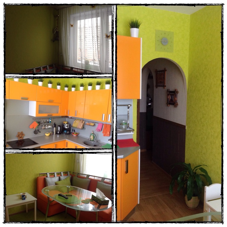 Почему-то про цитрусовые цветовая гамма кухни навеяла. Эдакий сочный постер с апельсином и лимоном. Возможно слегка банально, но если грамотно обыграть, то может получиться любопытно.