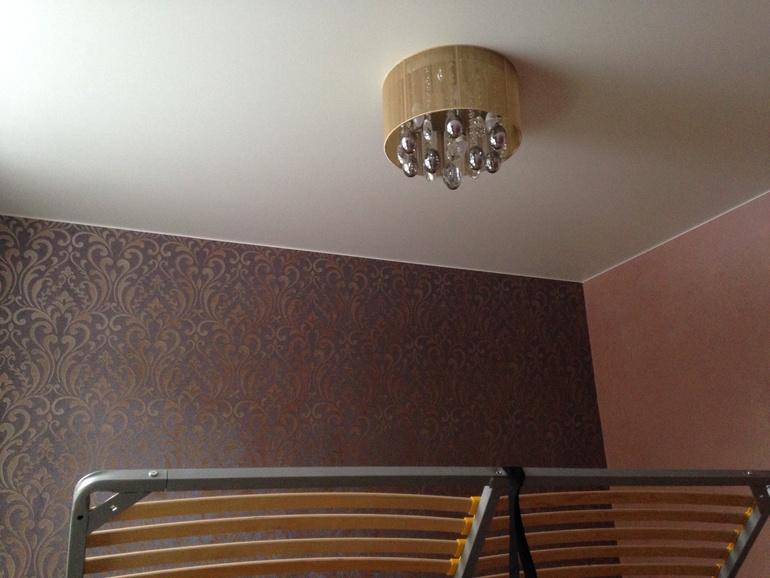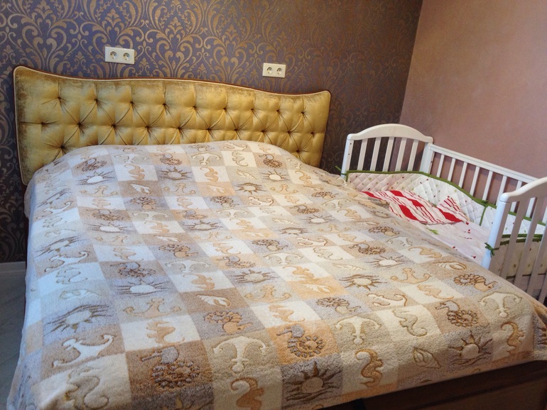 В спальне кровать пока без матраса, насчет обоев переживала, но вроде подошли по цвету к штукатурке и кроватке)