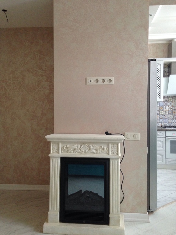 В гостиной из мебели пока только диван и камин) в нише будет шкаф-купе: