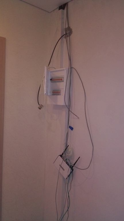 Вот щиток пока в "прекрасном состоянии". мы ещё не подключили домофон/телефон и прочую лабуду. Надо заказывать шкафна эту сторону стены, чтобы прятать в него всю приблуду мужа - два сервера, ставить висящий роутер и т.п. Главное, что щиток квартирный функционирует и отключает при необходимости разные розетки и свет.