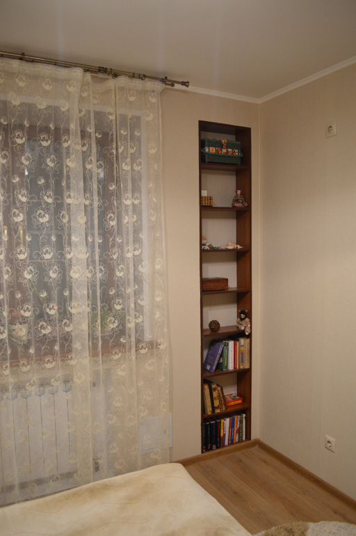на мой вкус багетка куцая и куда будут вышаться ночные портьеры для меня вопрос. я бы вообще не стала городить эти полочки, я так понимаю вы прикрывали стояки, прикупила бы багетку от стены до стены и повесила красивые ночные окно визуально бы увеличилось и комната стала более законченной. а в целом все обычно