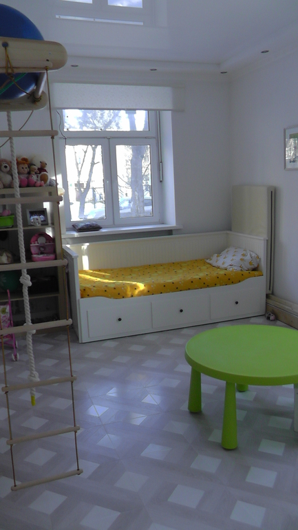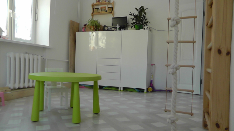 На стенах обои под покраску Арт, покрыты краской хаска супер белая, на полу ламинат. Почему белый? По тому что в детской миллион игрушек и книг и прочего прочего, что будет сюда довноситься. Пестрые обои и пестрые игрушки наводят меня на мысль хаоса, забрахолинности комнаты, неубранной комнаты. Я не против на открытые плоскости поставить любимые игрушки, но все все мне не нравиться. Поэтому у дочки шкафчики с дверками и дочка сама убирает и достает свои игрушки, что бы поиграть. Решение покраски в белый (к слову беле во всей квартире) вызовет наверно споры и неприятие, но может фото не передает всю атмосферу или друзья наши на нашей же волне, но многие из них переклеили свои обои на белый цвет.