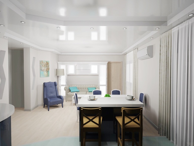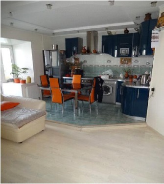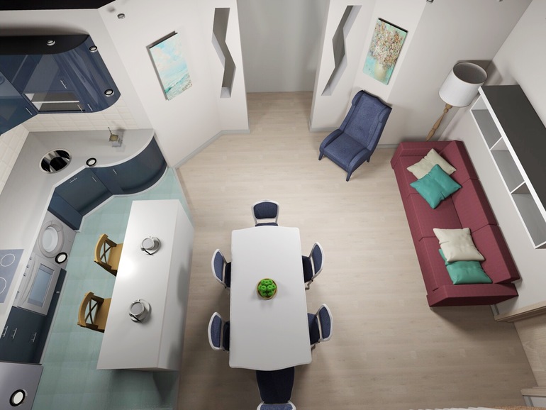 Дано: кухня (сама кухня стоит, барной стойки только нет), плавно переходящая в гостиную. Играть могу только мебелью - т.к. ремонт в квартире уже сделан предыдущими хозяевами и переделывать пока не на что.