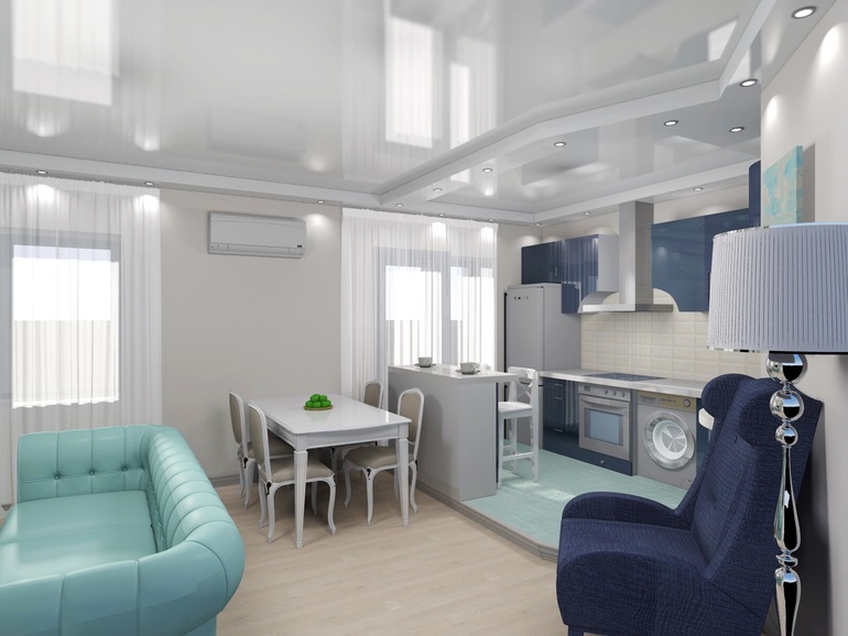 Есть еще вариант с бежевыми стульями и бирюзовым диваном (в реальности более темным чем здесь)