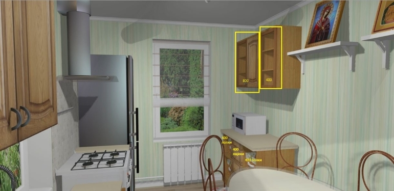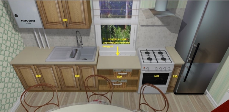 Неплохо, но у меня пара замечаний.1.с таким столом тесновато2.Газ выходит где? Если около котла, то вы через всю кухню будете до плиты его тянуть? По-моему, такое расстояние нельзя гибкой проводкой делать, хотя могу и ошибаться. В люблм случае не очень удобно.3.Где вы собираетесь приборы хранить? Корзинки это конечно мило, но я не уверена в их функциональности.4.Почему бы не сделать шкаф перед батареей вровень по высоте с остальной столешницей?Забор сделайте и все. Изнутри посадите что-нибудь приятное, растения какие-нибудь вьющиеся, которые будут этот забор обвивать. Это по-лучше вида на дорогу и пыли меньше лететь будет.Котел можно в шкаф закрыть, у нас тоже навьен.