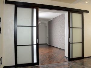 Есть двери только на нижней напраляющей, чтобы на полу планочки этой не было. Есть система где одна дверь заходит за другую и они сдвигаются на одну сторону, тогда эта палка сверху будет только с одной стороны.