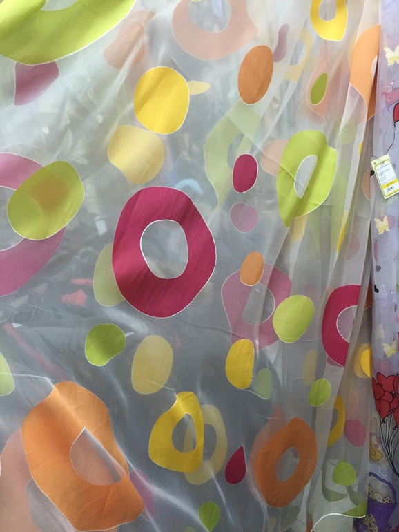 шторы подобрала с кругами салатовыми, оранжевыми, желтыми и малиновыми, все они на светлом фоне, очень яркие, красивые, насыщенные цвета. Вот фото материала в магазине, шторы еще шьются