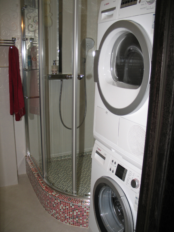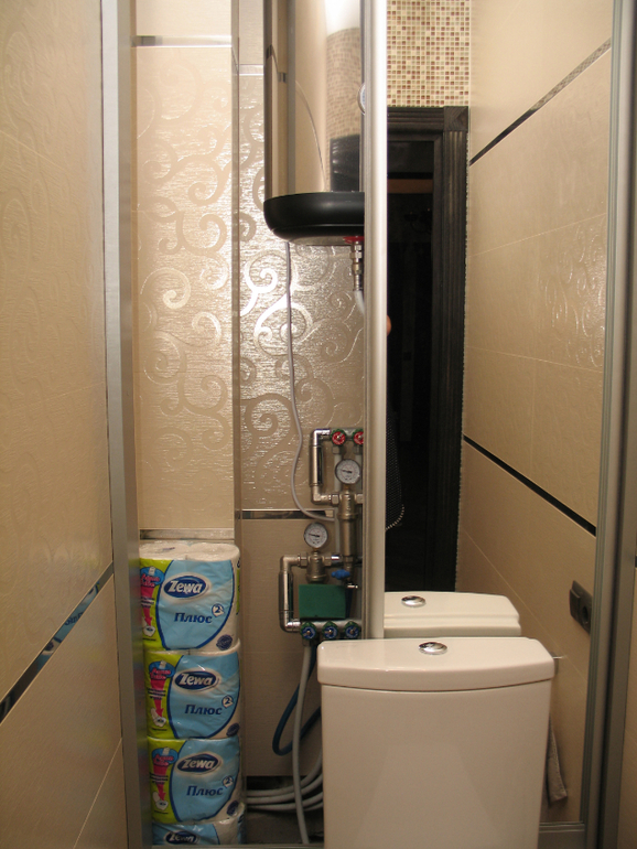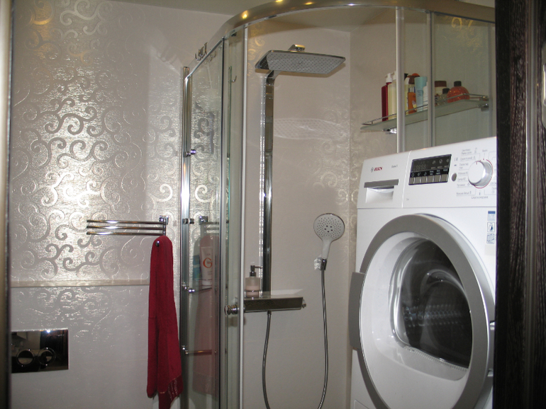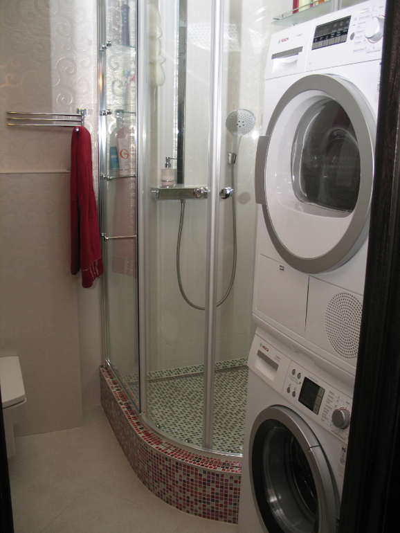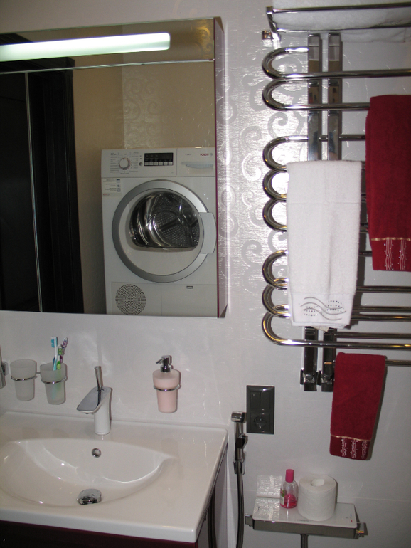 Прошу не судить меня строго. Санузлы абсолютно стандартные по размеру. Ванная 2,0*2,0 м и туалет 2,0*1,0 м. Объединять возможности не было, хотя соблазн и был, но все мы собираемся и уходим из дома примерно в одно и то же время, поэтому решили не жертвовать удобством ради красоты. Более того стояла задача разместить в ванной дополнительный унитаз, а также стиральную и сушильные машины.