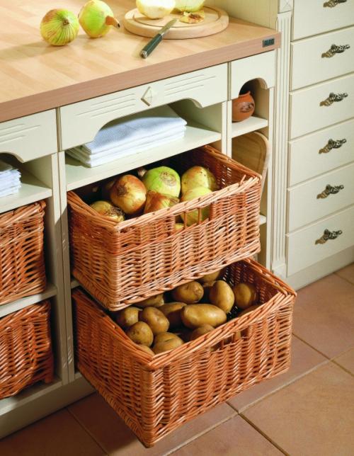 на кухне...между холодильником и стеной есть небольшое расстояние, купила плетеные контейнеры, ставятся один на один, так вот в них и храню, там же лежит морковь и лук