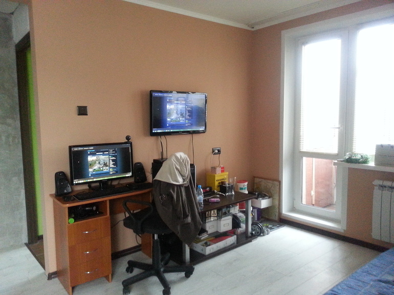 Шкаф купе во всю стену, склоняюсь к темному зеркальному. Диван натурального оттенка и рабочий стол. Все. У вас неопрятно, вск как-то навалом. Диван армянского цвета, вообще вырви глаз. Я как продавец мебели авторитетно заявляю что вписать синий диван в теплый интерьер дело непростое.